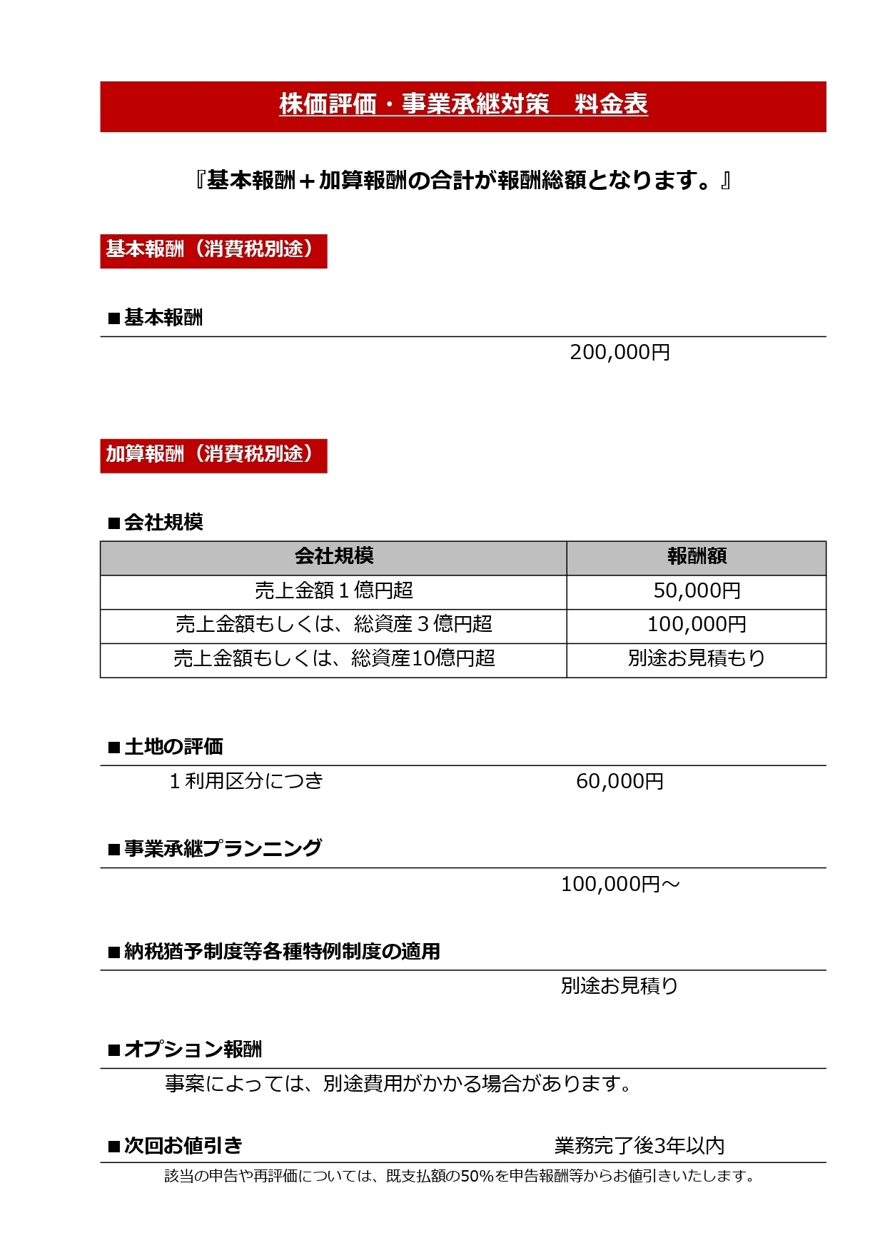 株価評価・事業承継対策 料金表